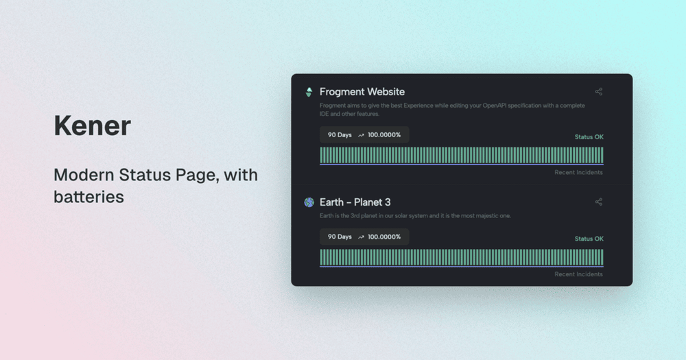 Kener is an open-source alternative to Opsgenie, BetterStack, Datadog, and UptimeRobot. It offers a beautiful and customizable self-hosted status page system, ideal for monitoring the uptime and performance of websites and APIs. Built with Svelte and Tailwind CSS, Kener delivers visually appealing, fast-loading status pages that can be easily deployed using Docker. It’s perfect for teams seeking a lightweight, privacy-respecting solution to communicate service availability transparently with users while maintaining control over their infrastructure.