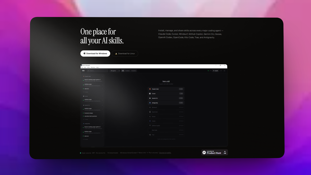 Skills Manager is a powerful desktop application designed to help developers manage AI agent skills across various coding platforms. With a focus on usability and efficiency, it allows users to browse, install, enable, and share skills seamlessly.