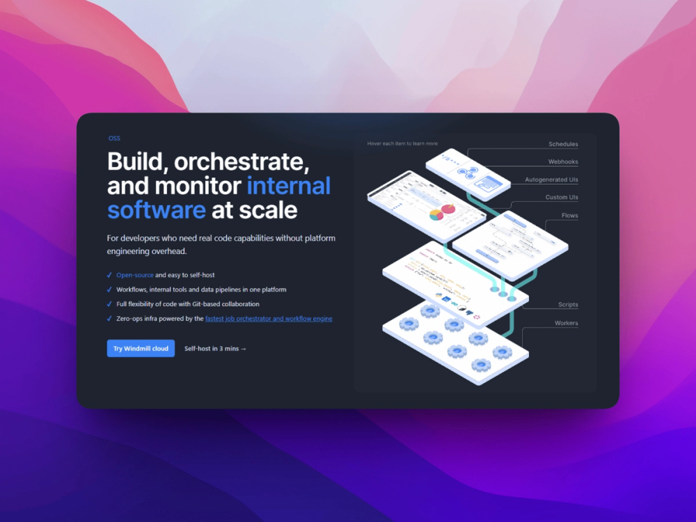 Windmill is a high-performance alternative to platforms like Retool or Zapier, specifically tailored for developers who prefer code-first solutions. It allows users to write scripts in mainstream languages such as Python, TypeScript, Go, PHP, Bash, and SQL, and automatically transforms them into structured internal tools with auto-generated UIs. Beyond individual scripts, Windmill excels at orchestrating these components into complex, distributed workflows (DAGs) with minimal overhead. Built for speed and reliability, it supports everything from a single-node VPS to large-scale Kubernetes clusters. With features like Git-based collaboration, granular RBAC, and zero-ops infrastructure, Windmill provides a robust environment for mission-critical automations while ensuring no vendor lock-in through its self-hostable open-source core.